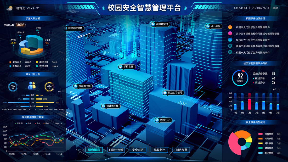 全方位立體式還原院區(qū)實(shí)貌,分圖層對(duì)院區(qū)的區(qū)域、建筑、單位、安防設(shè)備、管理設(shè)備、警情等進(jìn)行查看、監(jiān)控和跟蹤;通過(guò)院區(qū)各類(lèi)安防管理設(shè)備實(shí)時(shí)獲取各重點(diǎn)監(jiān)控區(qū)域的監(jiān)控?cái)?shù)據(jù),對(duì)各種突發(fā)事件進(jìn)行報(bào)警。通過(guò)人臉識(shí)別、車(chē)牌識(shí)別、行為識(shí)別、武器管理、營(yíng)區(qū)設(shè)備等各類(lèi)傳感器,對(duì)人、車(chē)、物及其行為的全面感知,保障營(yíng)區(qū)安全。
