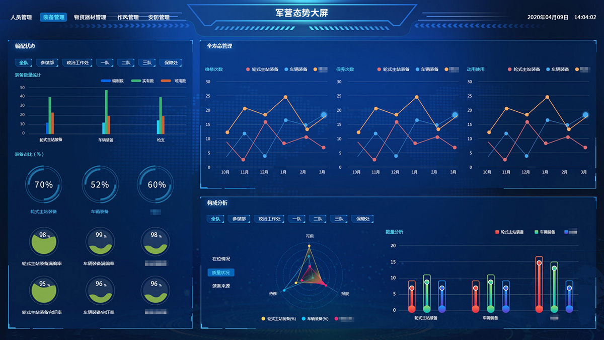 綜合保障系統(tǒng)依托物聯(lián)網(wǎng)、RFID識(shí)別和傳感技術(shù),著眼作戰(zhàn)精準(zhǔn)保障、戰(zhàn)備常態(tài)保障和官兵生活保障,對(duì)戰(zhàn)備物資、裝備器材、營(yíng)房物資和被裝物資等的全生命周期的電子化管理,對(duì)官兵的健康實(shí)時(shí)監(jiān)護(hù)。包含財(cái)務(wù)管理、軍需油運(yùn)、武器裝備、衛(wèi)勤管理、營(yíng)房管理模塊。確保部隊(duì)出動(dòng),車(chē)輛給養(yǎng)油料跟得上,裝備維護(hù)情況實(shí)時(shí)掌握,營(yíng)房管理工作平時(shí)與戰(zhàn)備同步推進(jìn)。