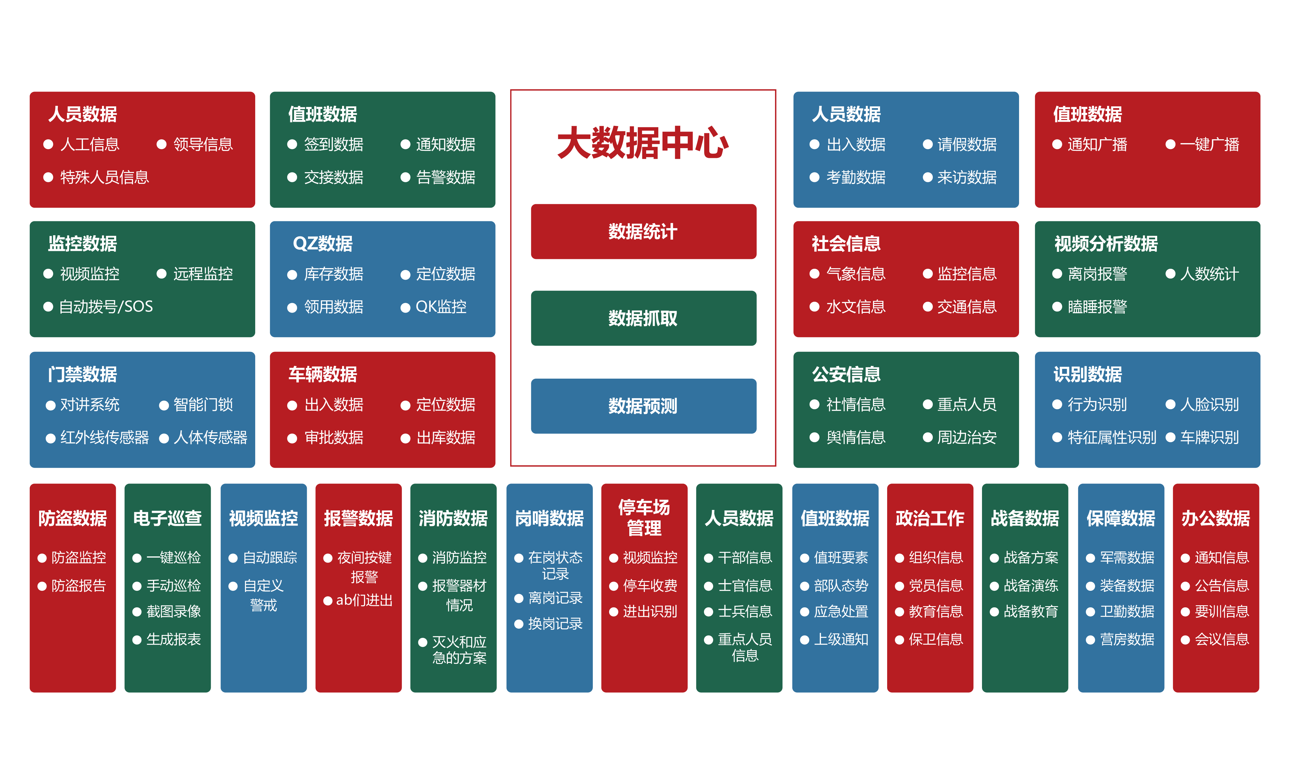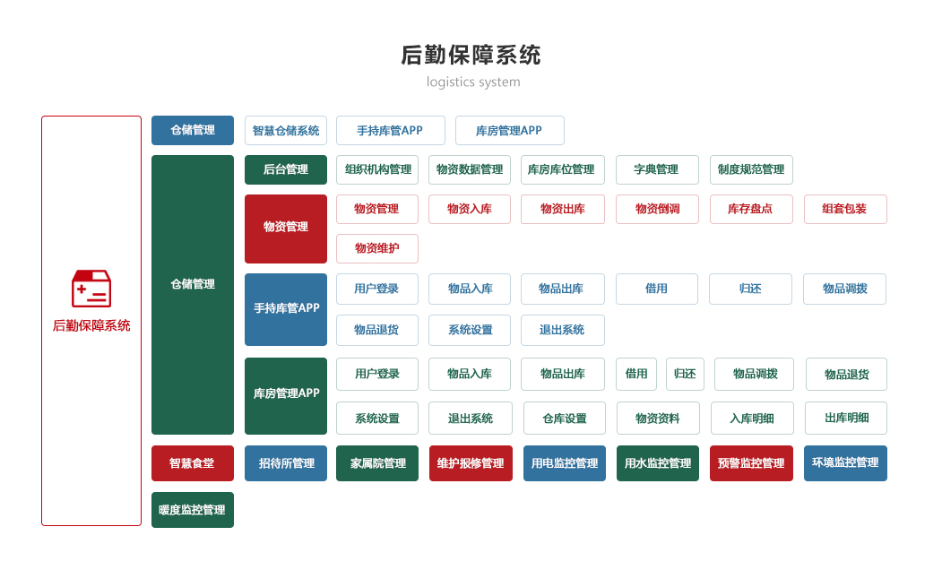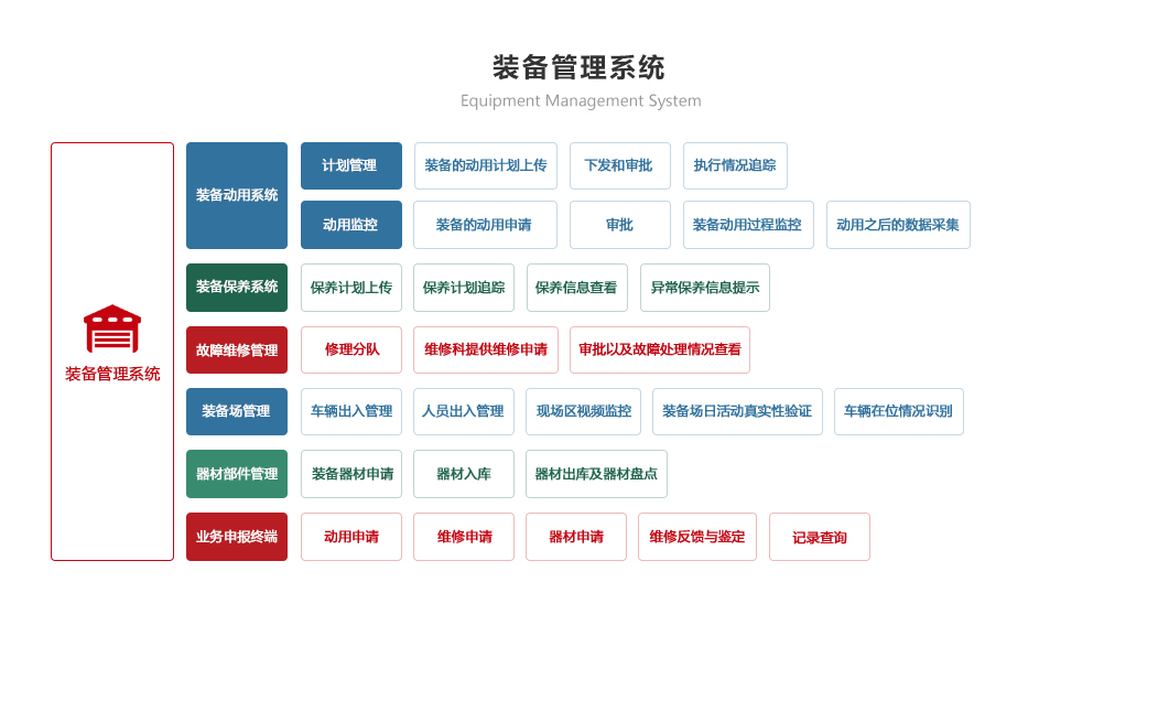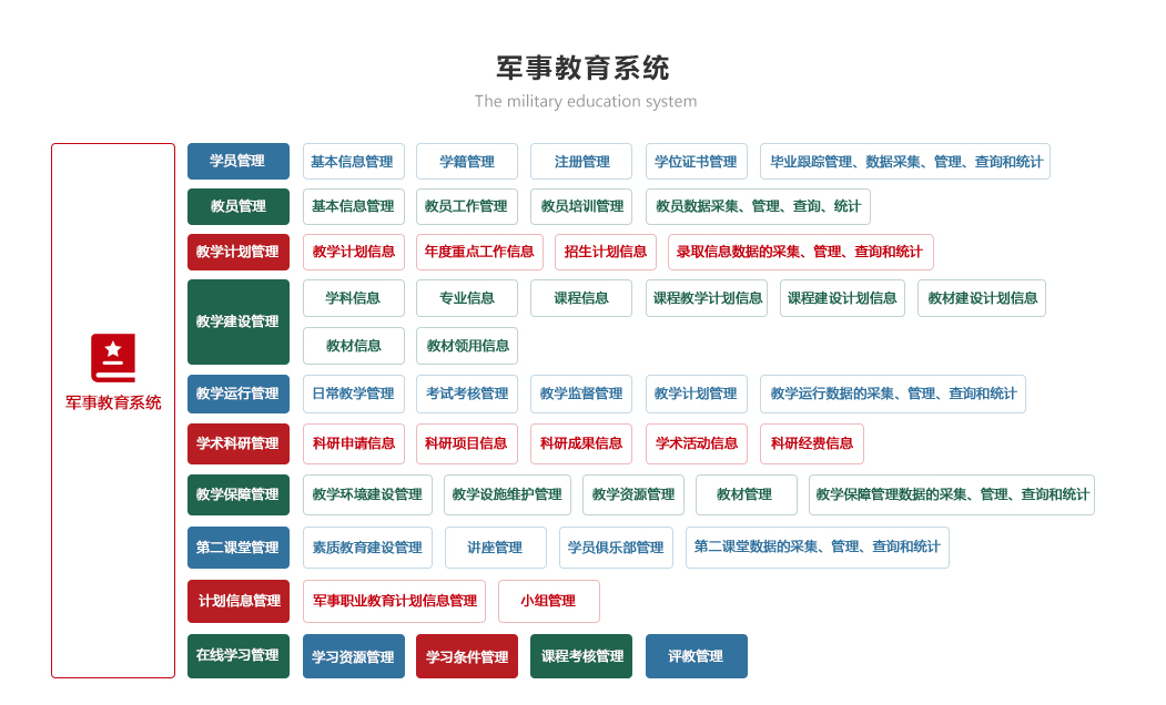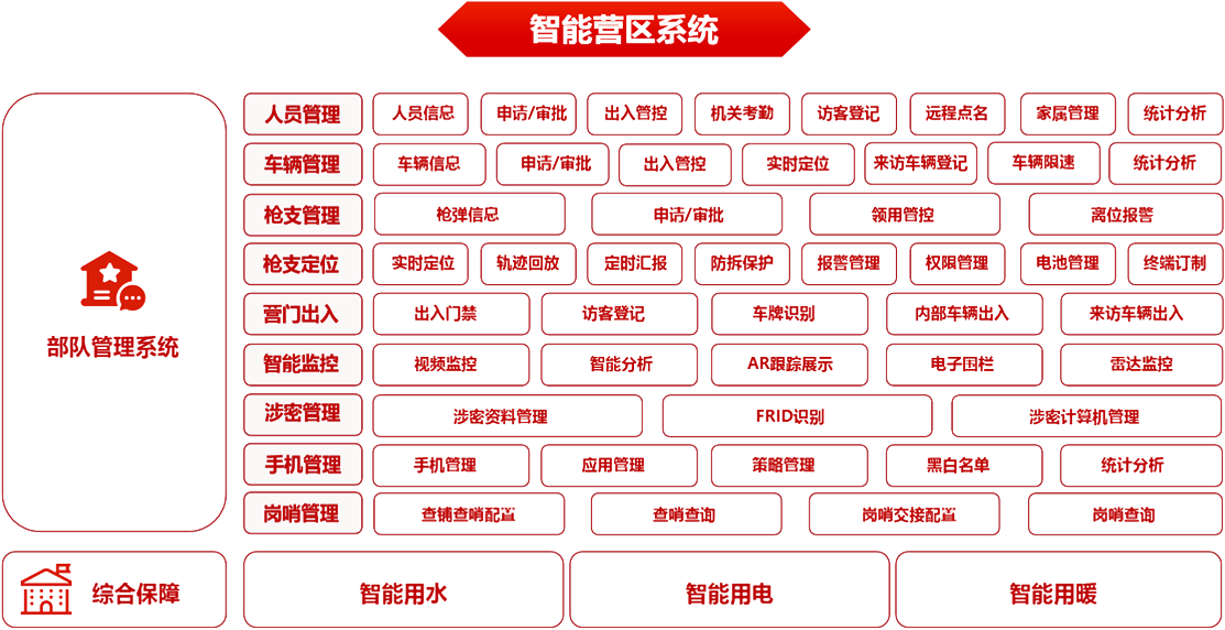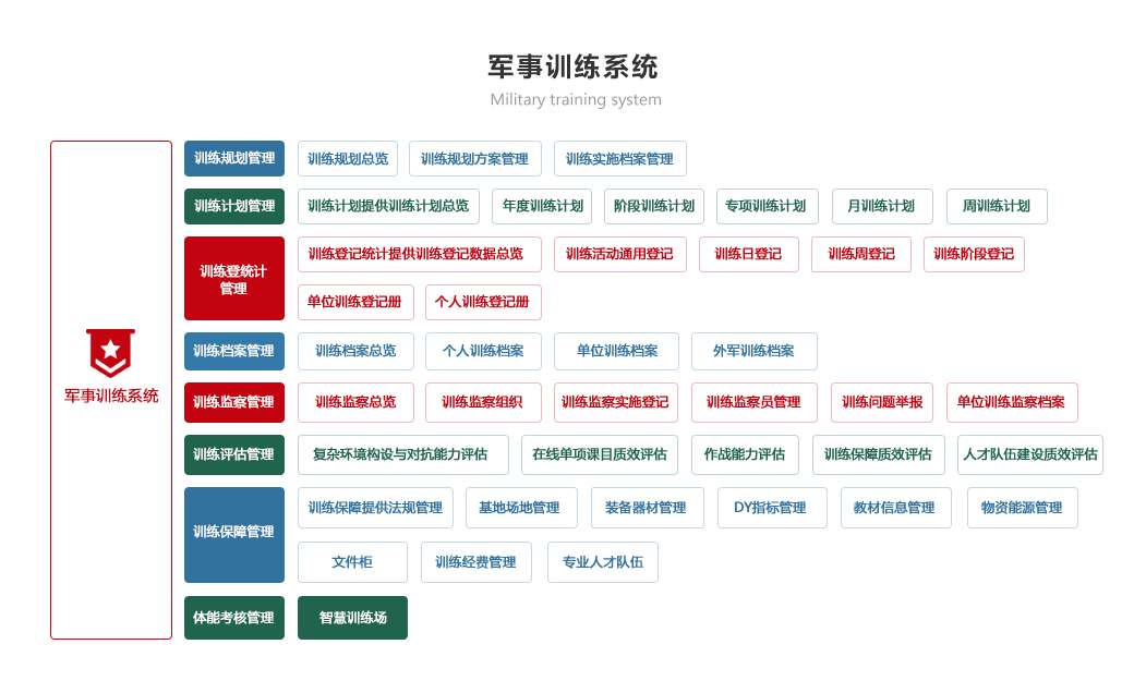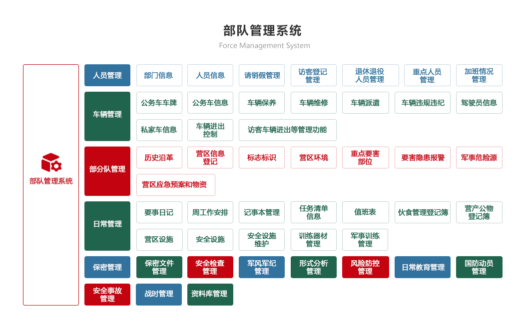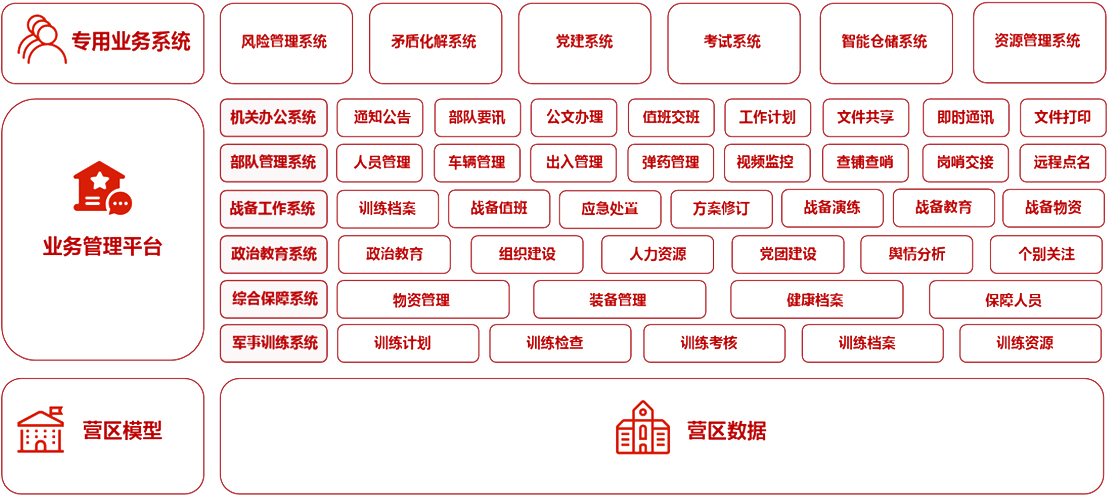 部隊(duì)管理系統(tǒng) 機(jī)關(guān)辦公系統(tǒng) 軍事教育系統(tǒng) 智慧政工系統(tǒng) 軍事訓(xùn)練系統(tǒng) 后勤保障系統(tǒng) 智慧安防系統(tǒng) 裝備管理系統(tǒng)
