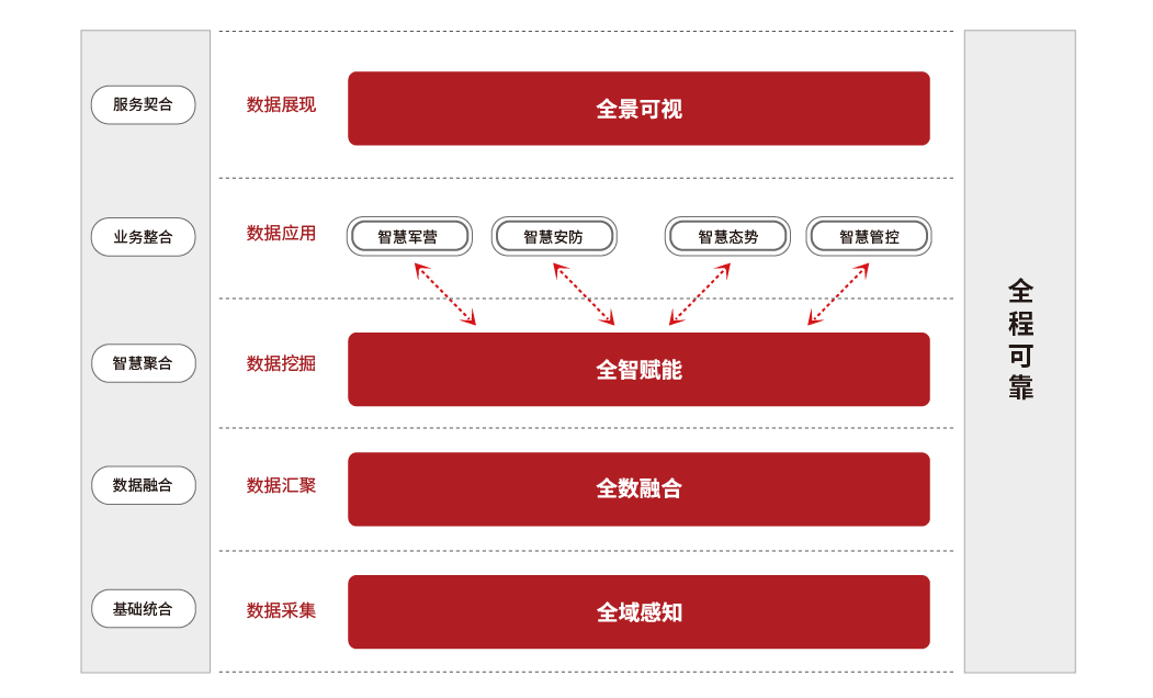 智慧軍營(yíng)建設(shè)是以“三融五跨”為指引,以數(shù)據(jù)資源為核心,促進(jìn)軍隊(duì)業(yè)務(wù)管理方式轉(zhuǎn)型升級(jí)的新路徑、新模式、新形態(tài)。 理念上要新,更加注重以人為本 / 機(jī)制上要新,更加注重統(tǒng)籌協(xié)調(diào) / 監(jiān)管上要新,更加注重安全可控